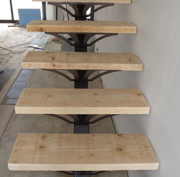 Finition brute métal, avec vernis incolore de finition, marches bois.